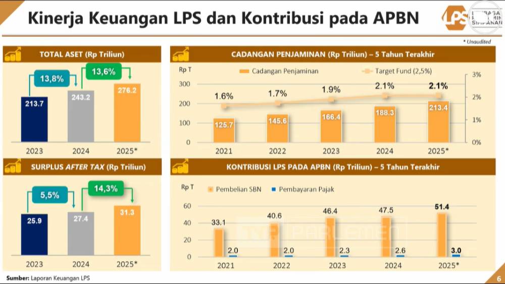 Peningkatan kinerja ini menunjukkan peran strategis LPS dalam menjaga stabilitas sistem keuangan nasional sekaligus memberikan kontribusi nyata terhadap pembiayaan negara. Dengan penguatan cadangan dan peningkatan aset, LPS dinilai semakin siap dalam menjalankan fungsi penjaminan simpanan serta mitigasi risiko di sektor perbankan. (AGO)
