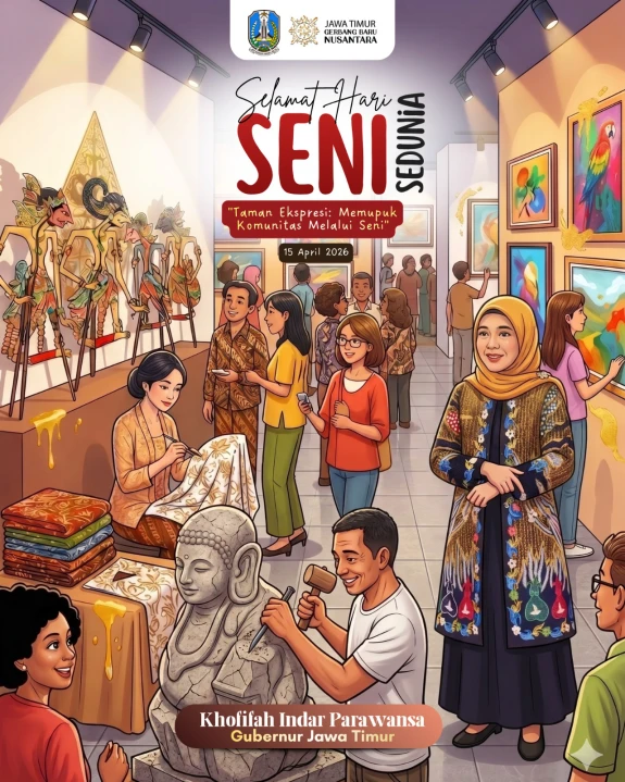 Ajakan disampaikan Gubernur Khofifah dalam momentum peringatan Hari Seni Sedunia (World Art Day) 2026, Rabu (15/4).