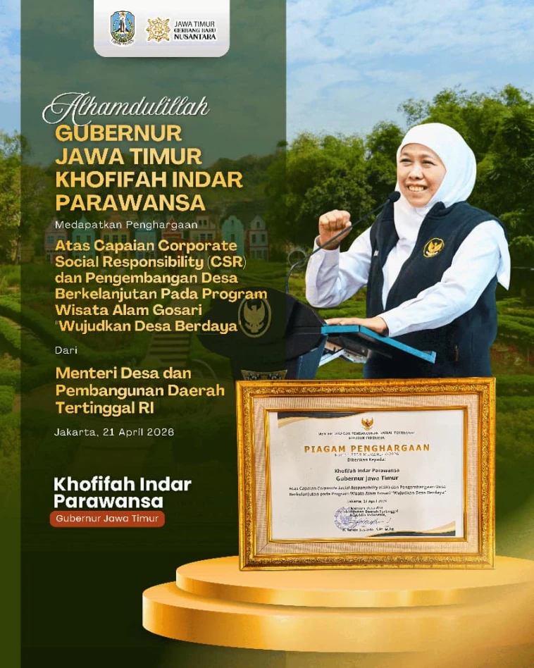 BERITAMU.ID – Surabaya, 24 April 2026 – Gubernur Jawa Timur Khofifah Indar Parawansa menerima penghargaan Corporate Social Responsibility (CSR) dan Pengembangan Desa Berkelanjutan (PDB) Award 2026 dari Kementerian Desa dan Pembangunan Daerah Tertinggal. Penghargaan ini diraih melalui keberhasilan Program Wisata Alam Gosari bertajuk “Wujudkan Desa Berdaya”.